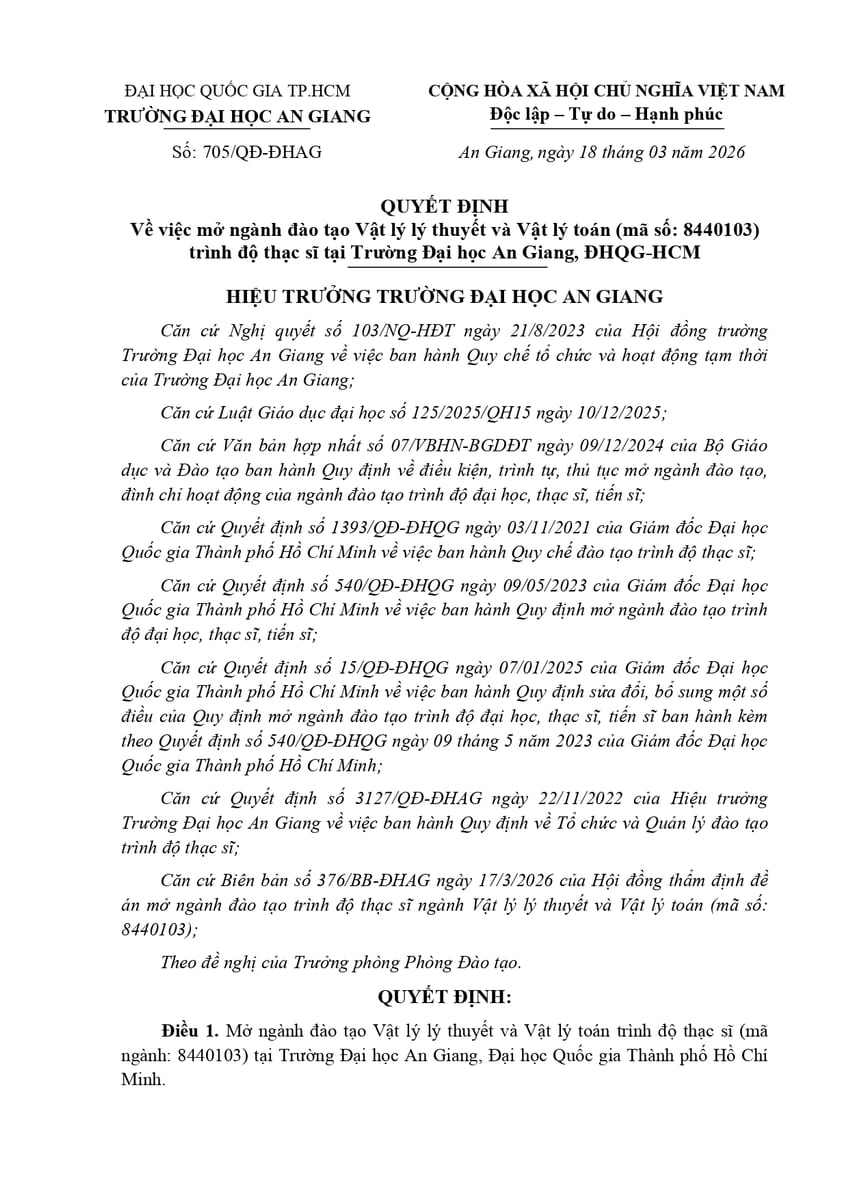Sau Đại học18/03/2026• 2225 lượt xemQuyết định về việc mở ngành đào tạo Vật lý lý thuyết và Vật lý toán - trình độ thạc sĩ tại Trường Đại học An Giang, ĐHQG-HCM Từ khóa #Quyết định mở ngành#Đào tạo thạc sĩ#Vật lý lý thuyết#Vật lý toán#Đại học An Giang Tin cùng chuyên mục Thông báo về việc tuyển sinh đào tạo trình độ thạc sĩ đợt 1 năm 2026 (dự kiến)19/03/2026Thông báo tuyển sinh sau đại học trình độ thạc sĩ năm 2025 - đợt 213/10/2025Thông báo về việc phối hợp với Trường Đại học Quốc tế tuyển sinh trình độ thạc sĩ ngành Quản lý Công đợt 2 năm 2025 tại Trường Đại học An Giang19/08/2025Thông báo về việc phối hợp với Trường Đại học Khoa học Xã hội và Nhân văn tuyển sinh trình độ thạc sĩ ngành Văn hóa học đợt 2 năm 2025 tại Trường Đại học An Giang15/07/2025Thông báo Về thời gian tổ chức Hội đồng xét duyệt đề cương định hướng nghiên cứu đối với ứng viên xét tuyển vào các chương trình đào tạo tiến sĩ và dự bị tiến sĩ năm 202527/06/2025Thông báo tuyển sinh dự bị tiến sĩ năm 202527/06/2025
